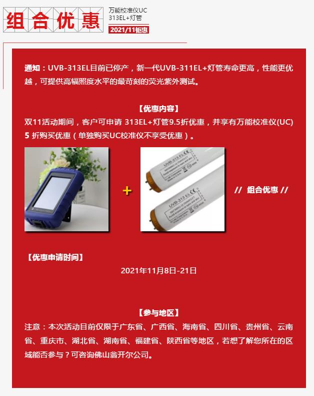18566398802雙11活動期間,客戶可申請 313EL+燈管9.5折優惠,并享有萬能校準儀(UC) 5 折購買優惠(單獨購買UC校準儀不享受優惠)。